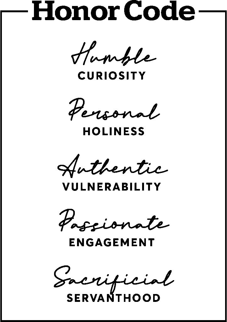 The Valley Creek College Honor Code is a set of shared values all students and faculty commit to. Our shared commitment to these values creates and upholds the culture and experience Valley Creek college is intended to be. The Honor Code consists of 5 foundational values that reflect the heart of who we want to become. They serve as guardrails that guide students on their journey of becoming kingdom leaders and people of love. The values are also an expression of our five distinctives (learn, become, connect, lead, love). Upon acceptance to Valley Creek College, students commit to living out the values in the Honor Code by acting as if they were so throughout their entire VC College experience.